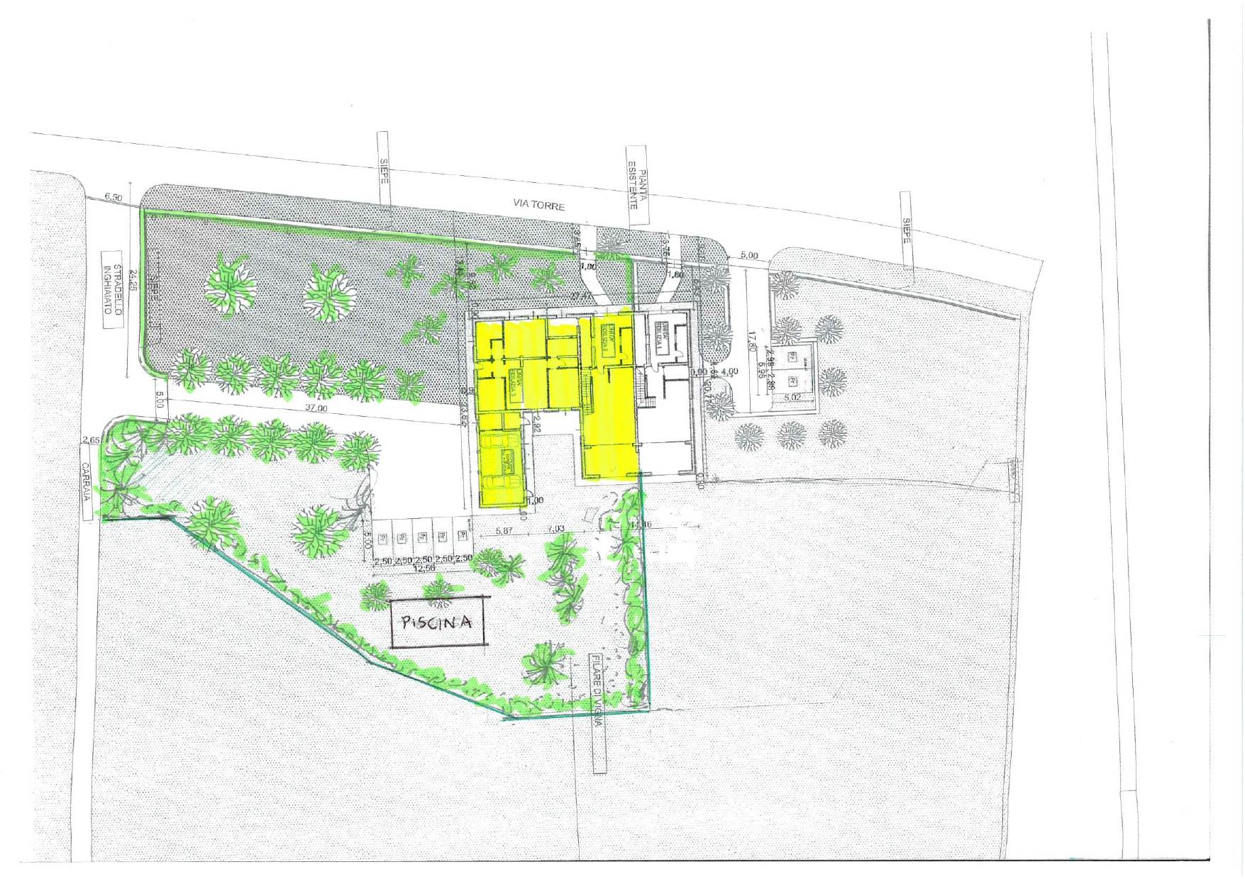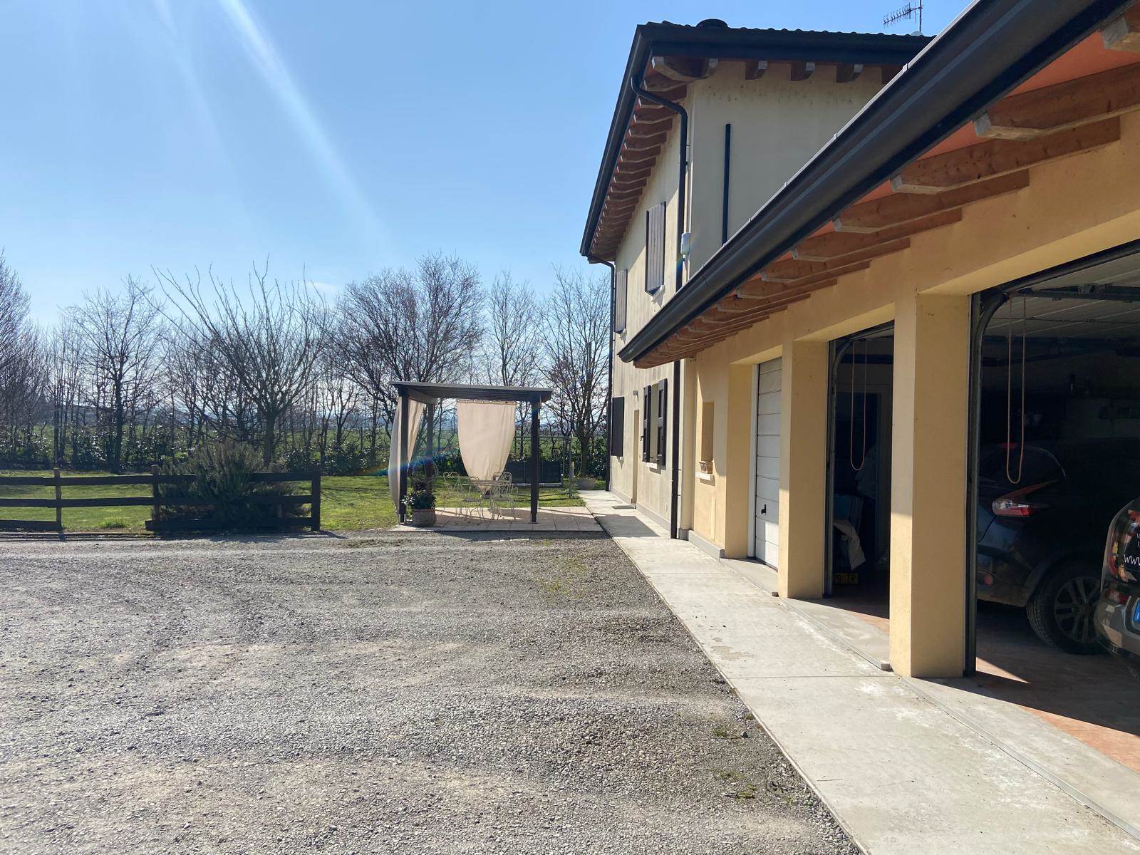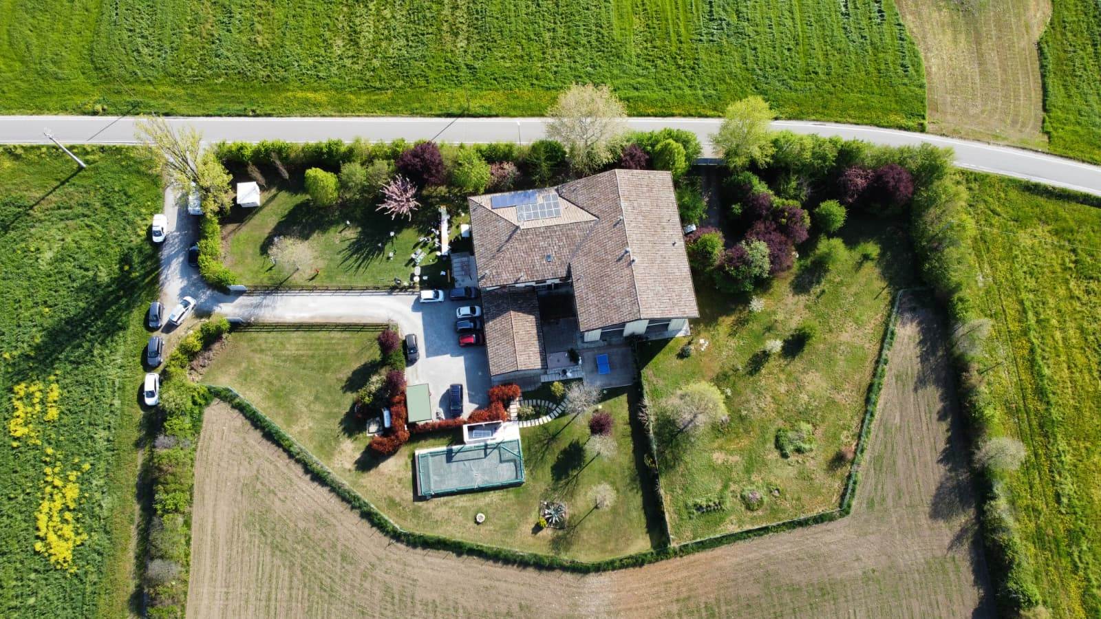 Il complesso immobiliare è arricchito da un edificio attiguo al piano terra adibito ad autorimessa e locali di servizio, oltre a ulteriori posti auto privati all’interno del cortile. Nel giardino in proprietà privata, della superficie di oltre mq. 1500, è inserita una splendida piscina con affaccio panoramico sulla campagna, perfettamente integrata nel contesto naturale.