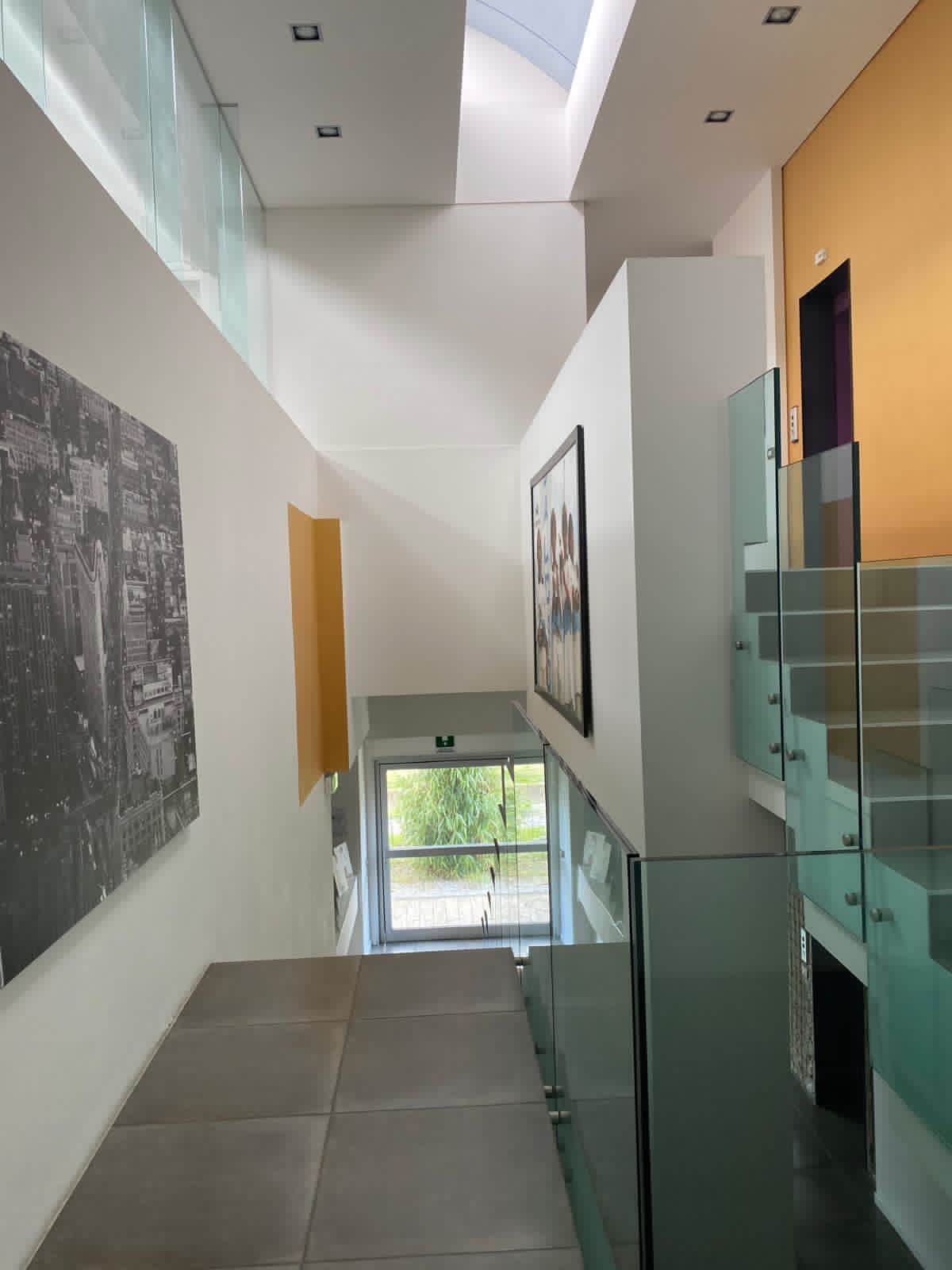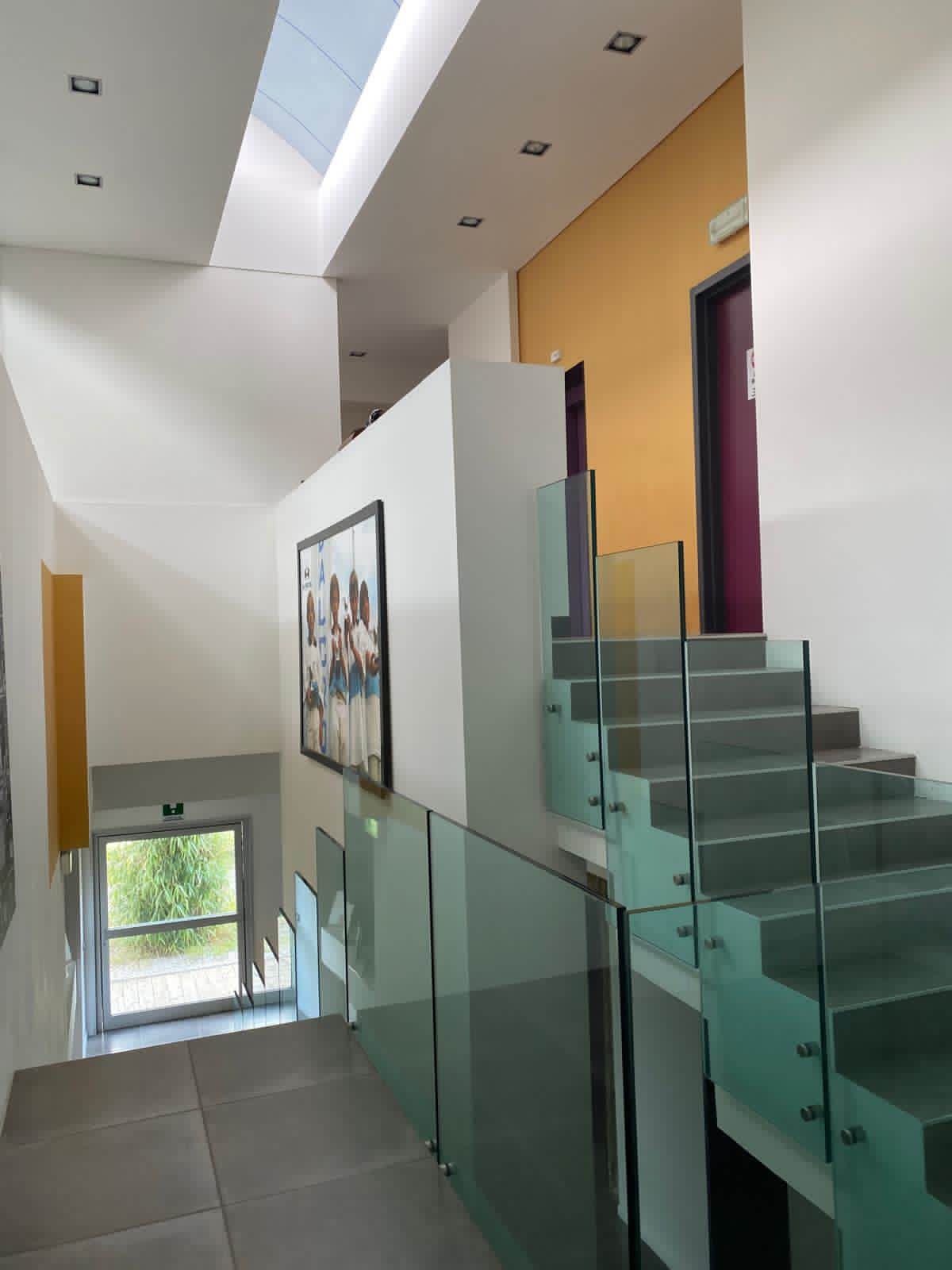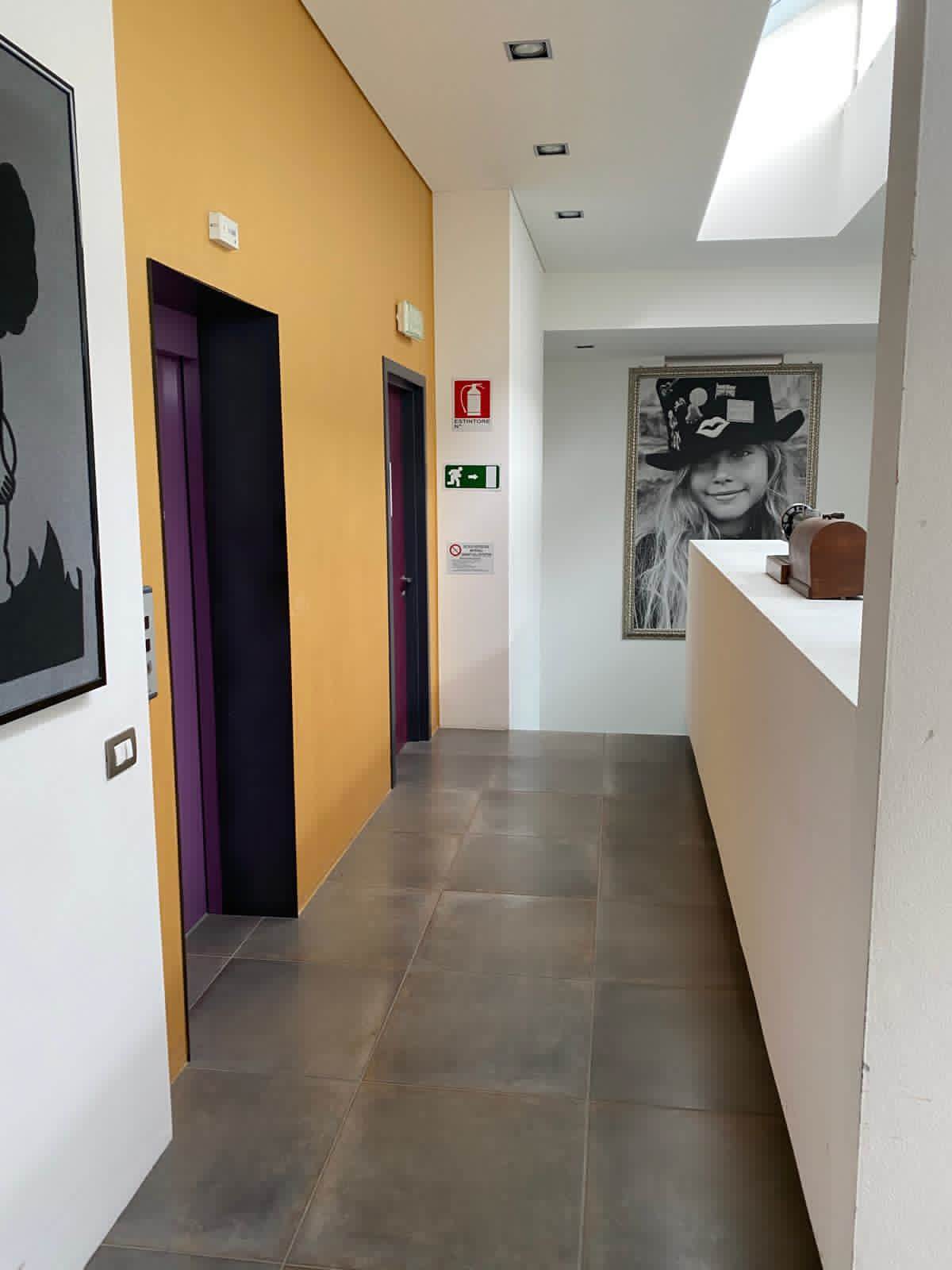 Piano terra: reception, locali adibiti a laboratori e uffici, magazzino, servizi igienici (incluso bagno per disabili) e ampio vano scale con ascensore.