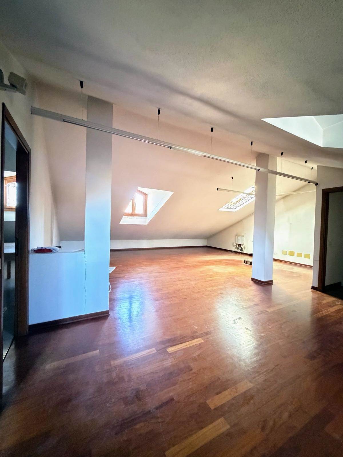 Primo Piano: Un ambiente luminoso che ospita attualmente una camera matrimoniale, un bagno finestrato con doccia e un balcone. La vasta zona open space rimanente permette di ricavare agevolmente altre 2 camere da letto, a seconda delle necessità.