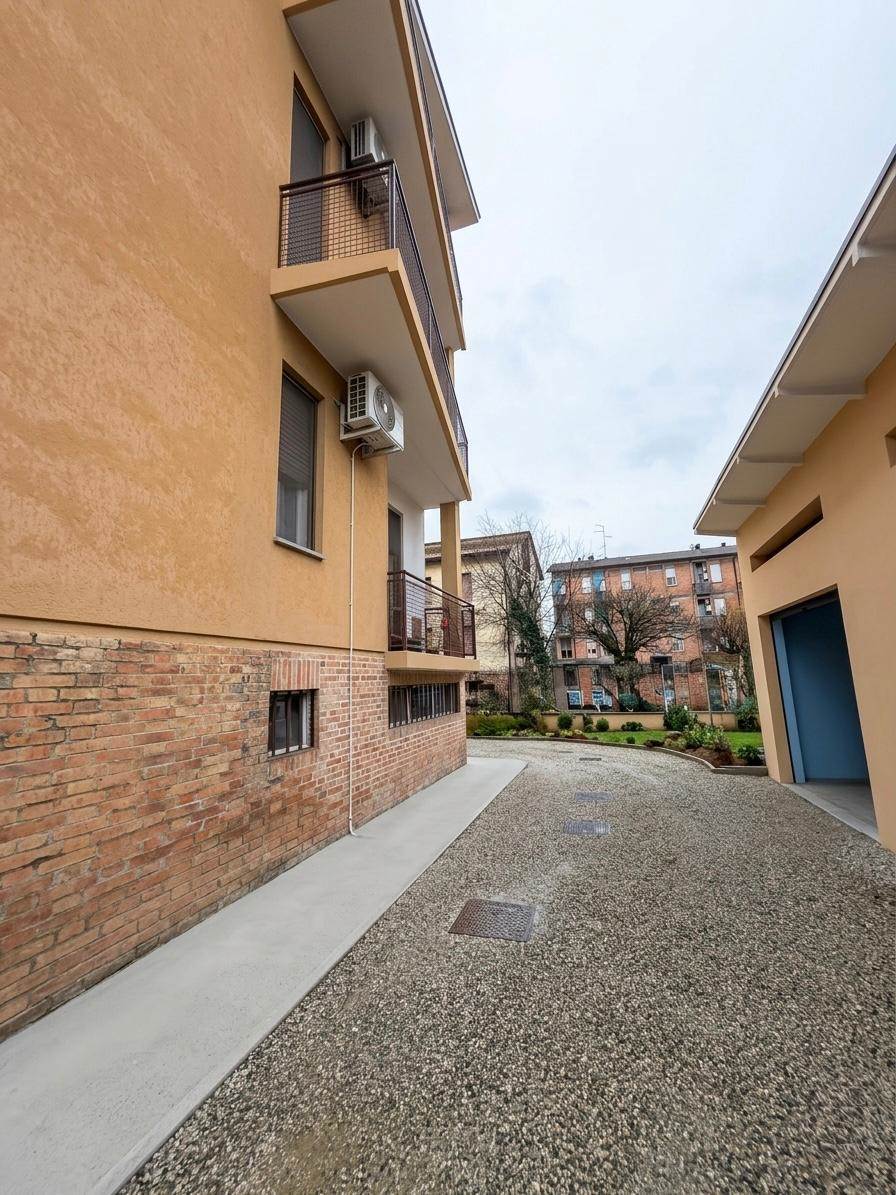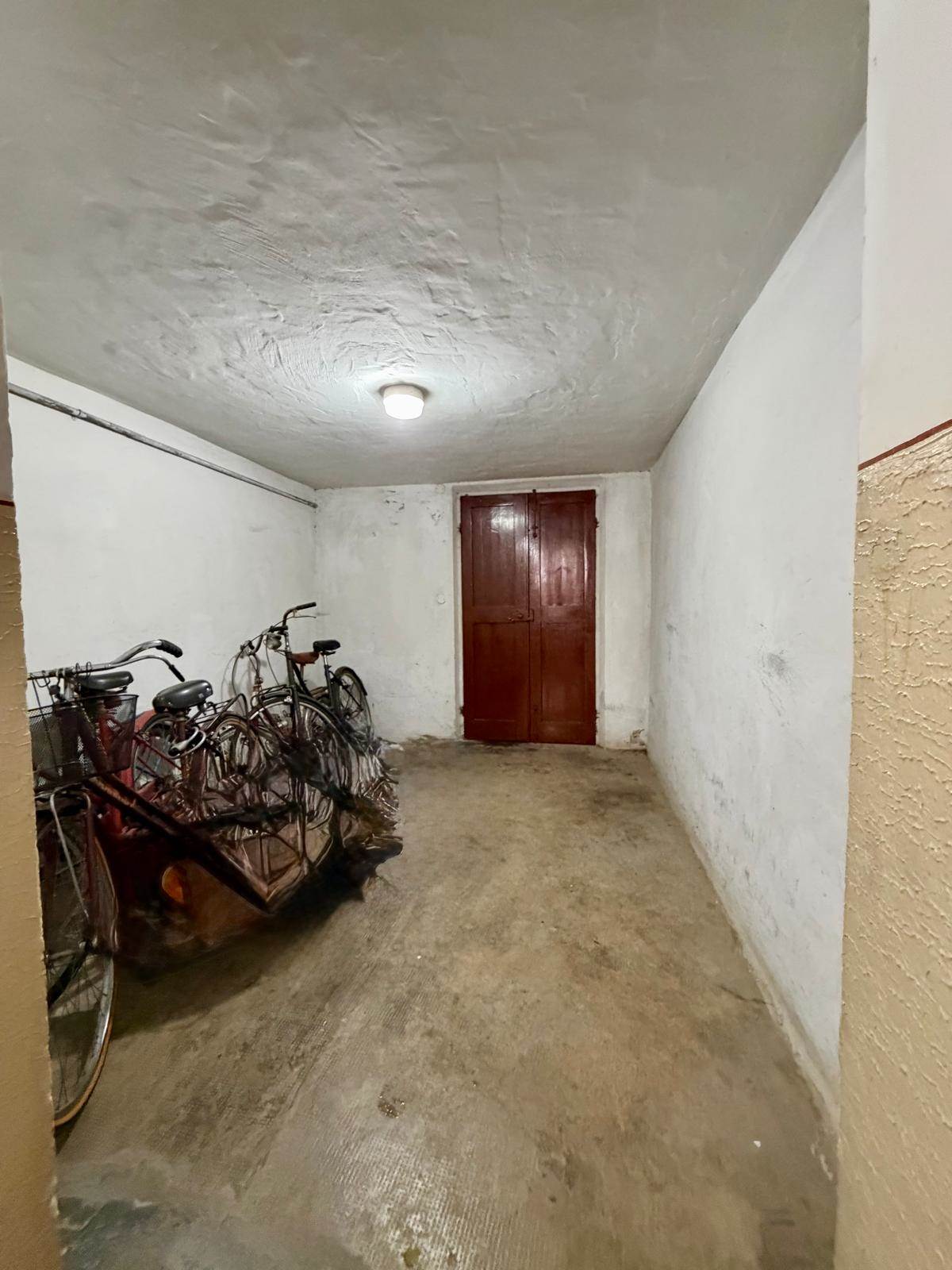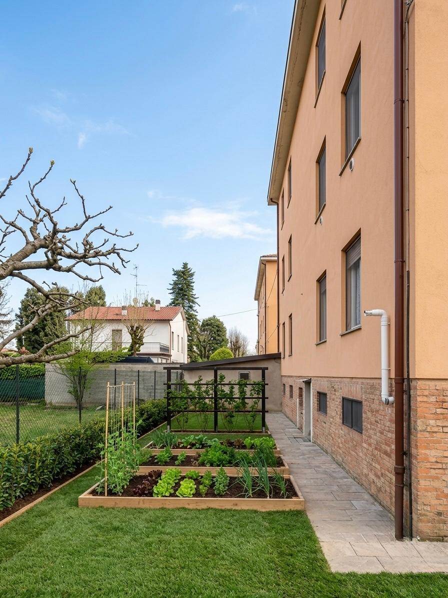L'immobile è composto da ingresso su corridoio, soggiorno, cucinotto con balcone, due camere da letto matrimoniali, bagno finestrato con affaccio sul balcone comunicante e ripostiglio. Le pertinenze includono una cantina ampia, un ripostiglio per biciclette comune, un posto auto e un piccolo orto privato. Il garage è in comproprietà.